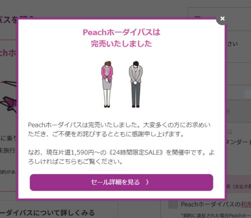 LCCのPeachが飛行機が乗り放題の「Peachホーダイパス」の販売を開始しました。 開始時間に申し込みをしようとしたところ、ログインできず。 開始から5時間後にログインできたのですが、以下のような表示。 残念でした。