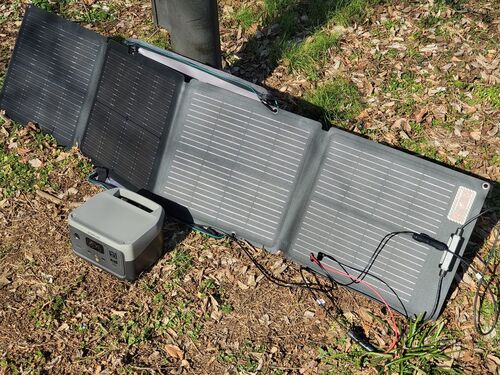 ポタ電の太陽光パネルを試用中。EcoFlowソーラーチャージャー110でEcoFlow RIVER 2を充電。弱めの日差しですが70Wで充電できています。AC充電では350Wで60分で充電できますので、70Wだと5時間くらいで充電できそうです。日差しの強さや向きで、上下するので…