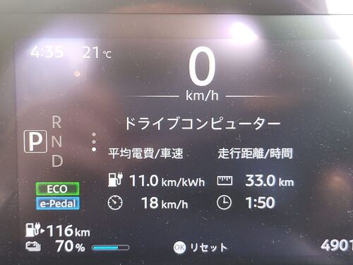 日産サクラ。パワーオフのときに、充電時間表示がされますが、ハンドルのカーソルキー操作でエコドライブレポートが見れることがわかりました。隠しメニュー?最近、エコで走るコツを覚えたので、電費最大値12km/kWhに近づくようになりました。
