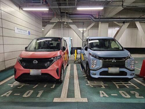 日産サクラ。成田空港駐車場に、サクラの兄弟車、三菱ekクロスEVがいました。