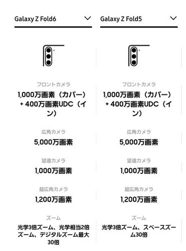 Galaxy Z Fold6とFold5の相違点。サムスンのページで比較できます。 カメラ画素数は変わらず、光学2倍相当が追加、バッテリーと耐性はアップ。Galaxy AIはスケッチアシストが追加。