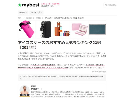 加熱式タバコで人気ブランドのアイコスですが、愛用しているとケースを使いたくなります。mybest「アイコスケースのおすすめ人気ランキング23選【2024年】」を監修しました。ケース選びの参考にご利用ください。 mybest「アイコスケースのおすすめ人気ランキ…