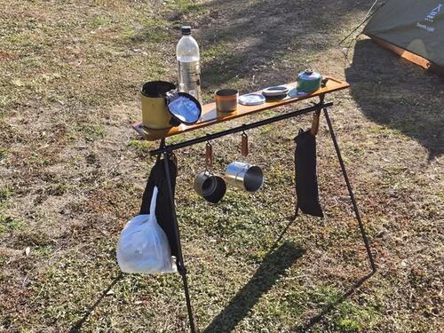 ハンギングラックウッド天板とダイソーレジャークッカー700mlゲット。どちらも在庫切れが続いていましたが、店頭にありました。 ダイソーレジャークッカー700ml。直火OKなので、シングルバーナーで湯沸かし。 エバニューチタンマグポット500は残念ながらスタ…