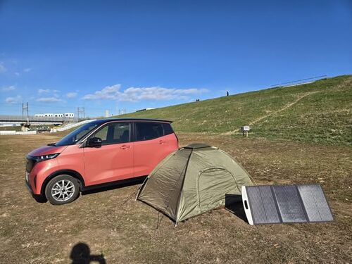 デイキャンプ。ポップアップテントにソーラーパネルとポータブル電源を使用。 ソーラーパネルで入力が70W、電気ひざ掛けで出力が50Wなので、ポタ電を消費せずに、電気ひざ掛けが使えました。サクラを横付けしているので、サクラのシガーソケットからインバー…