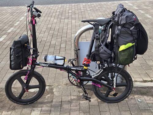 ミニベロliteptoでデイキャンプ。 ミニベロliteproにキャンプリュック40Lを積載。 なかなか安定せず、固定出来ても、ペダルが干渉したりとうまく行かず。タイヤが小さく、キャリアの位置が低いので難しいです。 最終的には、サドルバッグを外さずにキャリア…
