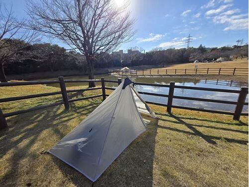デイキャンプ。気温2℃で、ほぼ貸し切り。ワンポールテントLanshanのフライシートをタープ代わりに使用。地面ぎりぎりにペグダウン、入口をクロス留め、隙間を減らして寒さを防ぎました。 陽射しがあるので幕内は暖かく、上着を脱いでいました。Helinoxグラン…