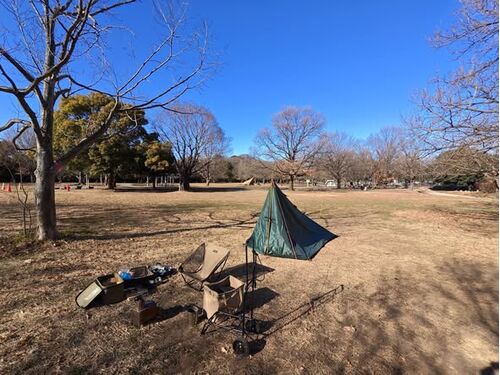 デイキャンプ。気温2℃で、ほぼ貸し切り。ワンポールテントLanshanのフライシートをタープ代わりに使用。地面ぎりぎりにペグダウン、入口をクロス留め、隙間を減らして寒さを防ぎました。 陽射しがあるので幕内は暖かく、上着を脱いでいました。Helinoxグラン…