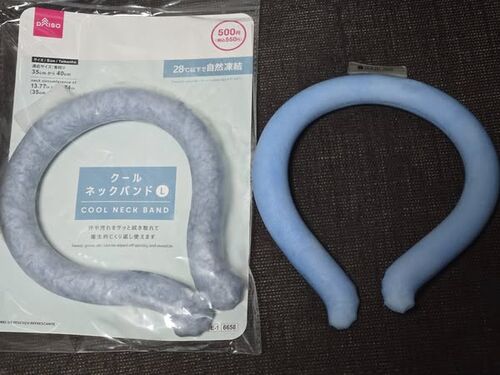 クールネックバンド。いつもは小林製薬の製品(1500円)を使っていますが、ダイソー版(500円)を買ってみました。28℃以下自然凍結で、冷凍庫で5分のくらいで固まります。性能は同じようです。 3色人気カラー 新素材 クールリング アイスネックリング アイス ネ…