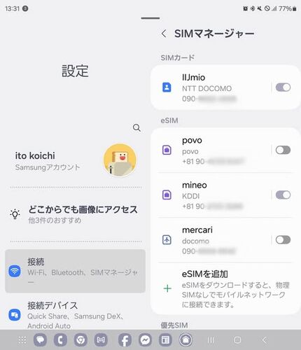 Galaxy Z Fold6でSIMカードを1枚、eSIMを3種類、4回線使用中。