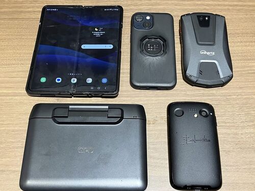 今日のモバイル。Galaxy Z Fold 3、BALMUDA Phone、iPhone 13 mini、Titan Pocker、GPD MicroPCの5台。端末が小型になり、便利になってきたのですが、台数が減らないのが悩みの種です。