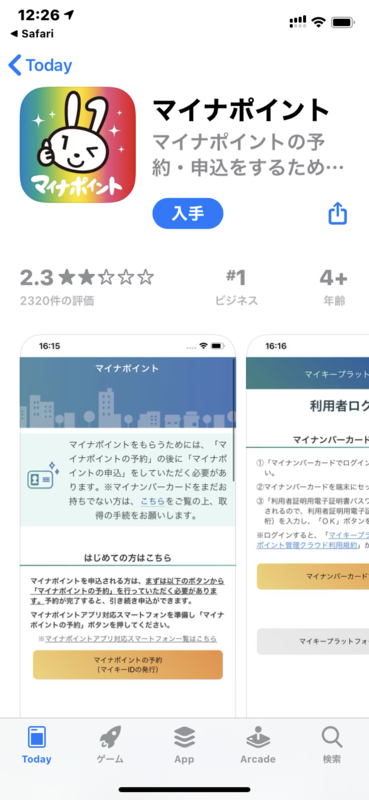 マイナポイントアプリを入手していない場合はインストールします。