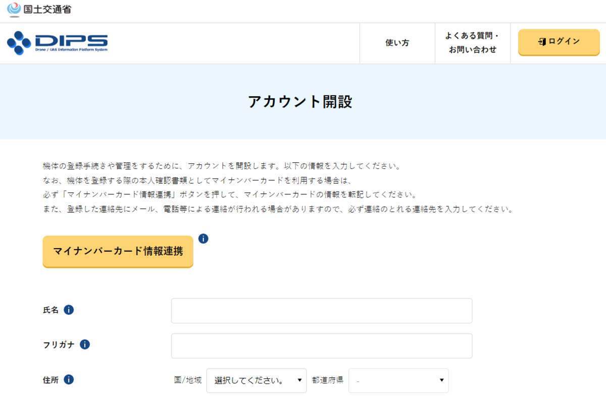 ユーザー登録完時にマイナンバーカードの連携をしておくと、機体登録でマイナンバーカードの利用ができます。