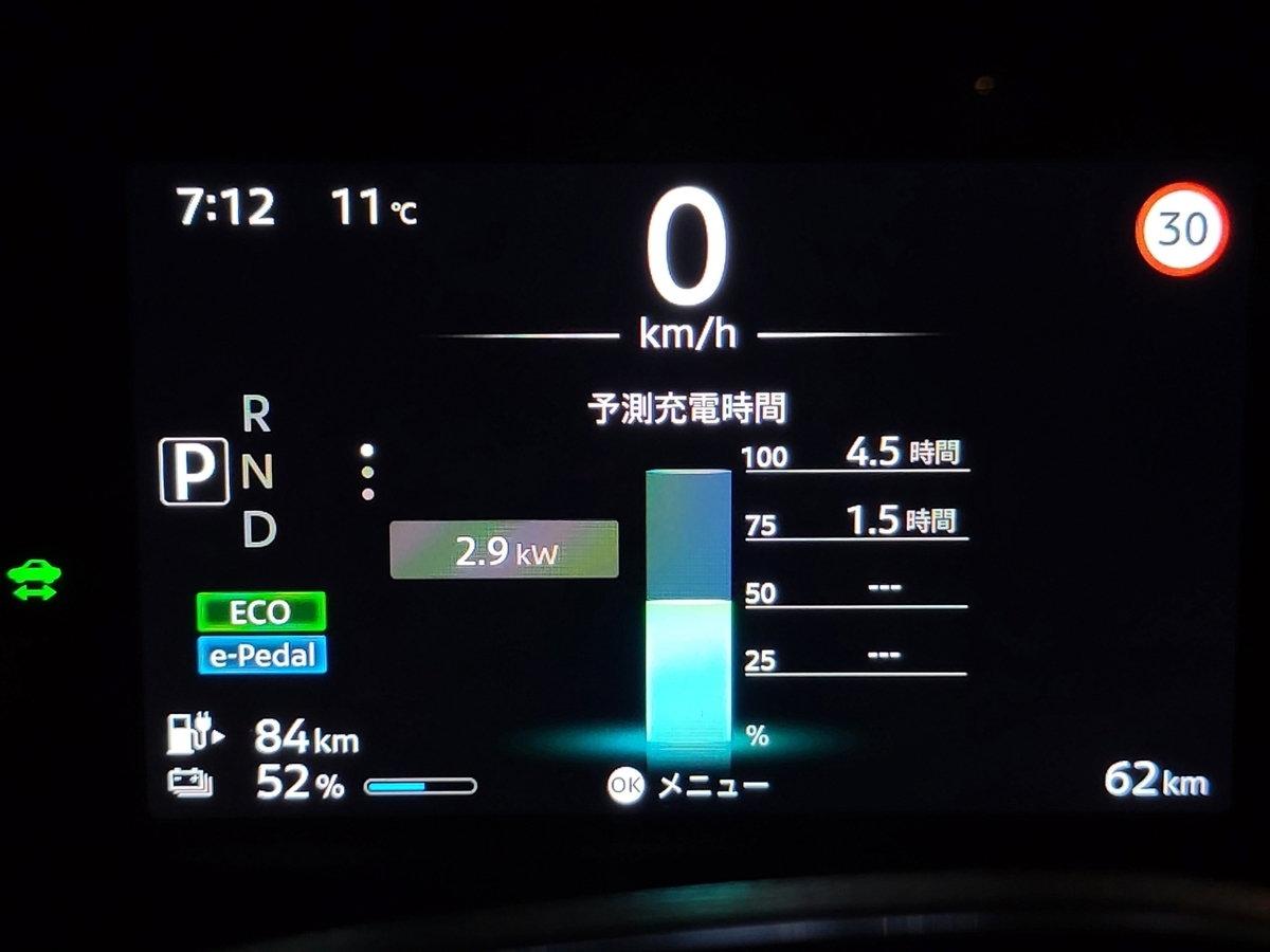 充電前の様子。運転席のディスプレイで表示。バッテリーは52%の状態で、予測充電時間が4時間30分と出ています。