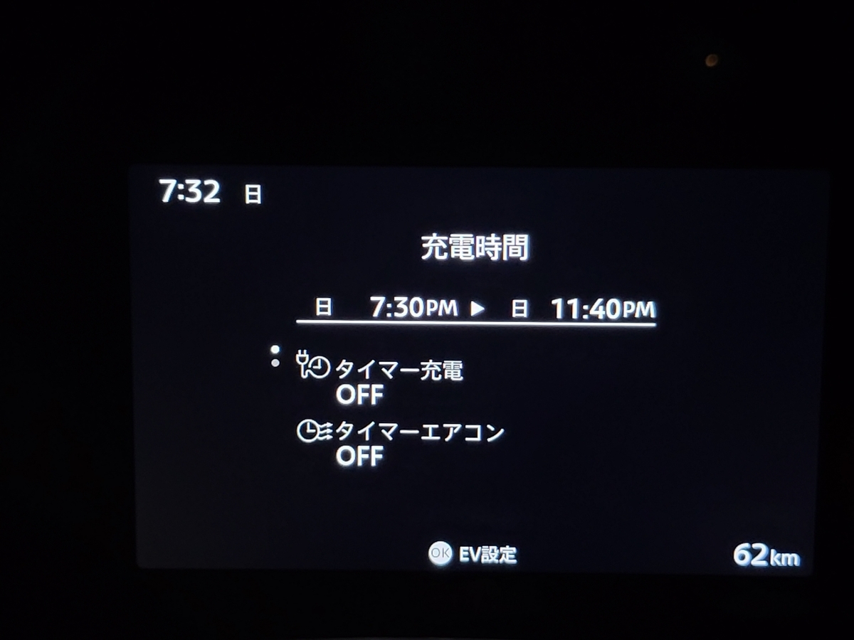 充電時間が表示されます。ここで表示されているタイマーエアコンは、充電ケーブルを繋いだまま、タイマーでエアコンを事前に付けることができるので、走行前につけておくことで、走行中の電気の節約になります。