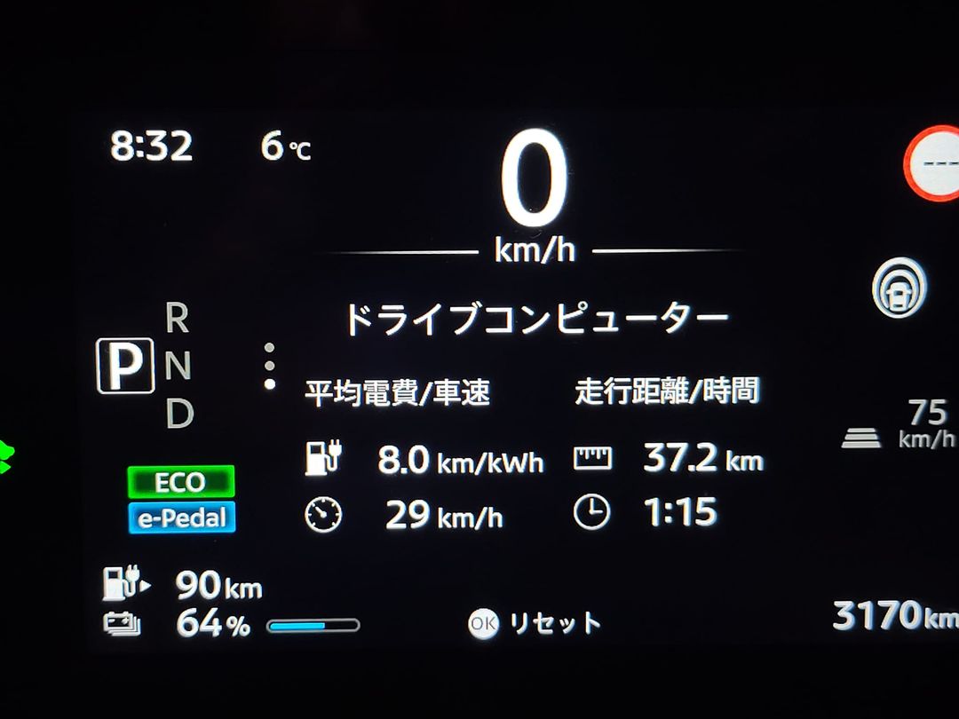往路のデータ。東京→横浜。距離37km。バッテリー94%→64%、30%消費。電費8km/kWh。ECOモード、e-Pedal、エアコン、第3京浜はプロパイロット75km設定。