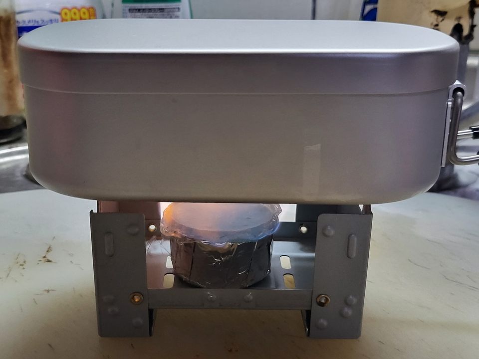 焚き火のけいぞう先生にメスティンを譲っていただいたので、ダイソーのミニストーブと固形燃料で炊いてみました。0.5合を30分水に浸けて、燃料が消えるまで25分間炊いて、10分タオルに包んで蒸らしました。美味しく炊けたのですが、少し焦げてしまったので、0.5合炊きのときは固形燃料15分くらいで試してみます。