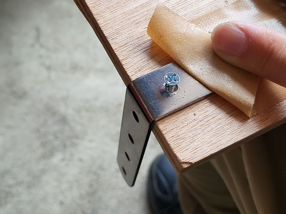 ダイソーで木ネジセット。日産サクラのリアゲートテーブルのカメラプレートとL字プレートがガムテープで仮留めだったので、木ネジで固定。