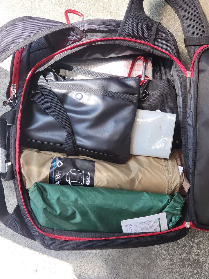 キャンプ道具をかわるビジネスリュックにまとめました。ウルトラライトからはまだ遠いのですが、今までコンテナケース2個をキャリーで運んでいたので、随分コンパクトになりました。タープとポールの軽量化できれば、小型リュックに入れられそうです。
