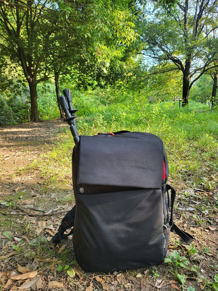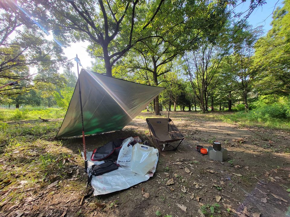 デイキャンプで使ってみました。リュック一つにパッキング。Helinox グランドチェア、CanDoオックスフォードタープ、Lekiトレッキングポール。