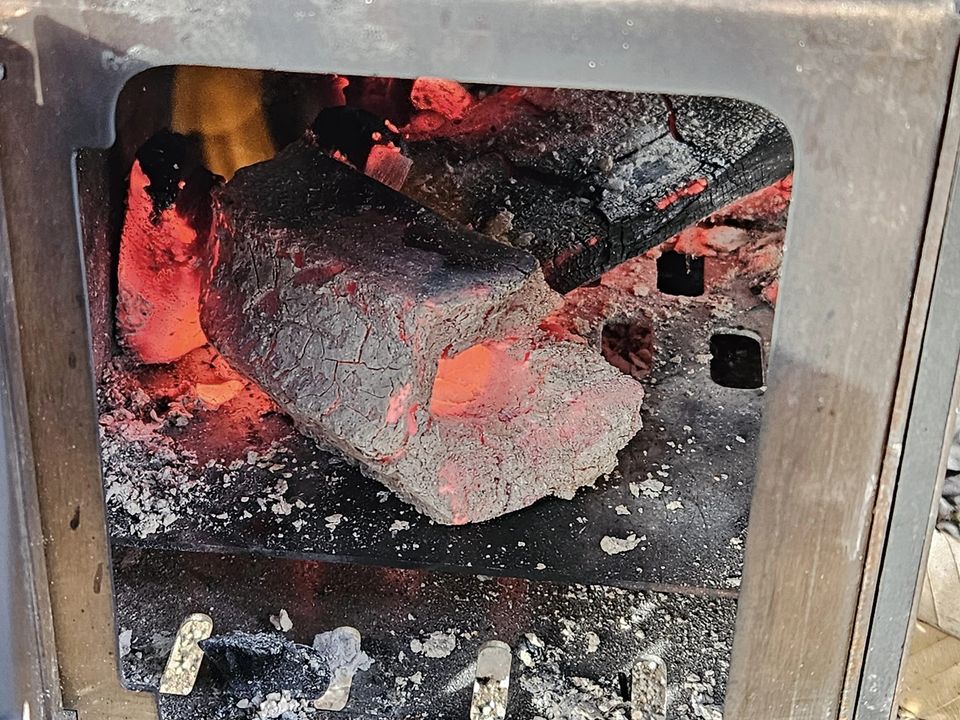 オガ備長炭で薪ストーブのテスト。着火に時間がかかりますが、火持ちが非常に良いです。煙と臭いがないので、煙突を延長して排気できれば、タープ内の暖房で使えそうです。