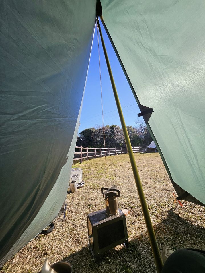 タープをパスファインダーにして、薪ストーブが熾火になったので、開放した入口近くに置いて暖房。延長用の巻煙突は、固定用のホースバンドが届いたら試してみます。