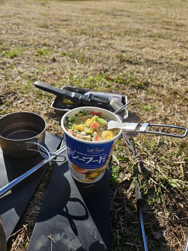 別日のデイキャンプ。池の畔で風が強く、薪ストーブでも着火に苦労しました。カップヌードルとトーストで手抜き料理。