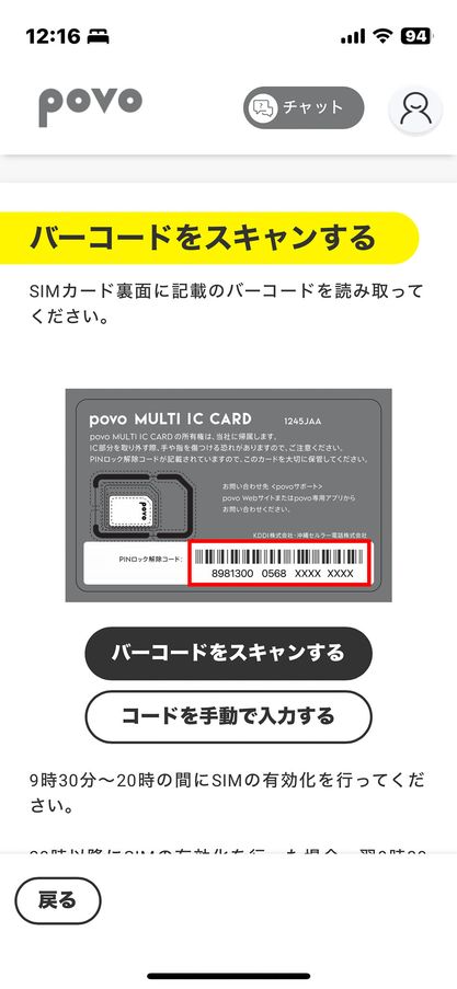 2024-01-02 povo2.0の二枚目SIMを申し込み。トッピングなし32kbpsでTitan PocketをGoogle Keep専用端末にしてみた モバイル 格安SIM 二枚目のpovo2.0が届きました。 povo2.0のSIMカードはアプリ上で有効化します。SIMカードの台紙のバーコードをスキャンします。 povo2.0をTitanPocketに設定。トッピングなしなので低速ですが開通しました。