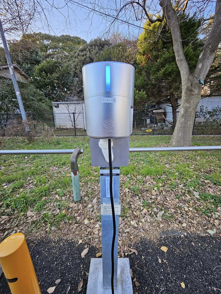 都立公園のEV充電が昨年10月から有料になりました。普通充電を試しています。普通充電はTerraChargeが設置してありました。専用アプリで充電器のQRコードを読み取り、充電器のロック外して、持参したケーブルで充電、と手間が多いです。持参した充電ケーブルの表示では10Aしか出ていないので、あまり充電できなそうです。