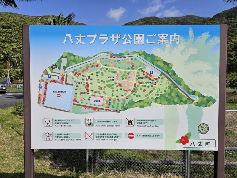 いよいよキャンプ場へ。役所に事前に電話して、八丈プラザ公園を予約しました。
