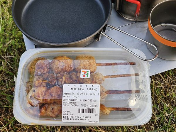 強風で焚き火は自粛して、シングルバーナーで鍋焼きうどん、焼き鳥を温めて食事。