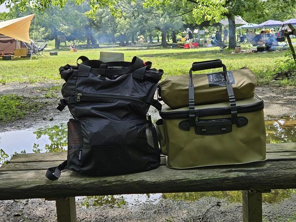 チェアリングは荷物が少なめ。ワークマン20Lトートリュックとダイソー防水バッグ。ダイソーバッグに薪を含めた焚き火グッズが全部入りました。
