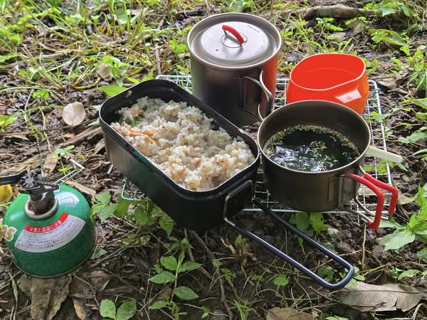 食事は、無洗米で炊き込みご飯とワカメスープ。