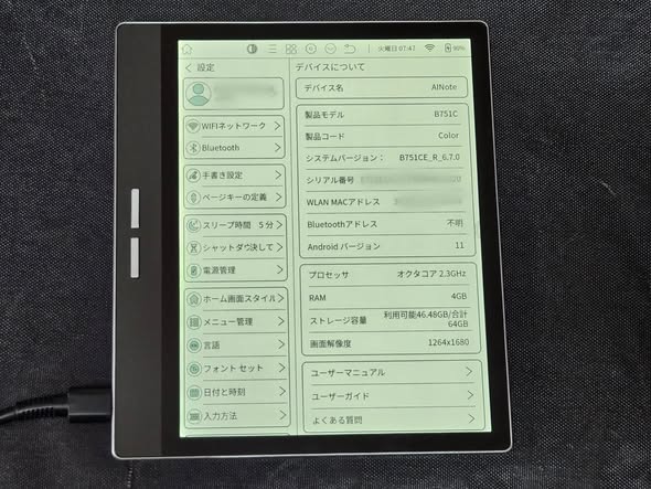 カラーE ink端末Bigme B751C。Android 11搭載でGoogle Playが使えます。RAM 4GB, ストレージ64GB、画面解像度1264×1680、WiFiとBluetooth搭載。